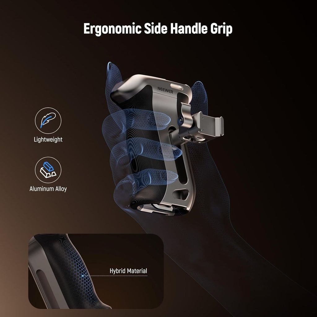 - Multiple Accessory Mounting Points- With two 1/4" threads, one 3/8" thread for ARRI locating, one cold shoe, and four wrist strap slots, the side handle can connect NEEWER RGB62 LED Video Light, CM14 PRO Microphone, MA006 Monitor Mount, and CA090 Camera Wrist Strap for function expansion